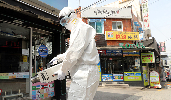 韓國衛生人員在首爾街頭噴消毒劑,加強防疫。路透社