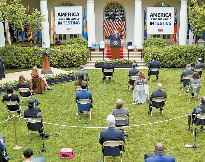 對於各州重啟經濟進程,特朗普指責一些州「速度太慢」,並指「關門」有很多負面影響。周一記者會上,試圖營造一個「任務完成」的節點性時刻的特朗普,背後立一個巨大牌子,上面用全大寫字母寫「美國引領世界檢測」,強調美國檢測數是全世界最多的,已經可以安全開放、重啟經濟。