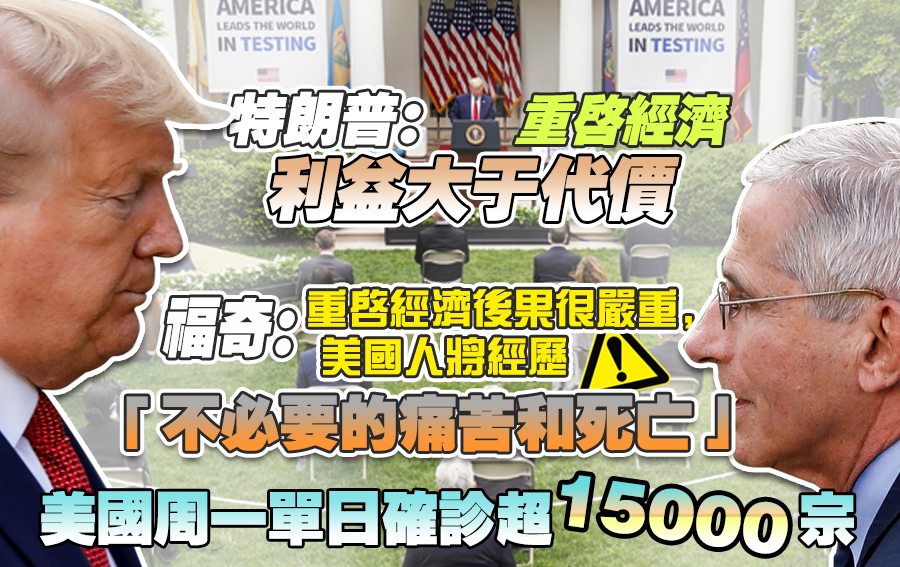 当地时间周一单日确诊超15000宗,惟总统特朗普执意要尽快重启经济。“重启经济利益大于代价。”他声称,知道经济活动重开将无可避免出现人命损失,但不重开的话亦会有人死亡,就如有些人会死于滥药及自杀一样。