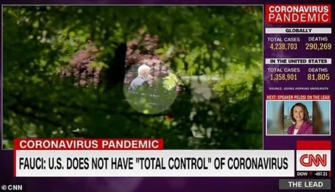 CNN报道截图显示,彭斯戴着口罩现身白宫。