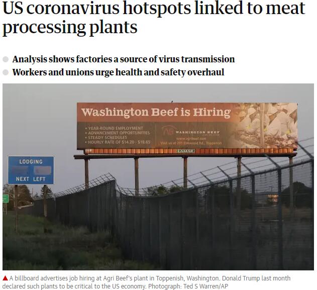 据《卫报》报道,美国肉类加工中的多数工人是移民。过去的两个月里,随着公众对肉类加工厂工作条件日益强烈的质疑声,美国至少有30家肉类加工厂停工,几十家工厂减少作业。但在美国总统特朗普的鼓励下,许多任务厂已重新开工。4月28日,特朗普签署行政令,动用《国防生产法》授权要求肉类加工厂在疫情期间继续运营,并称这些大型肉类加工厂是“关键基础设施”。