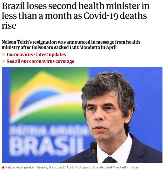 另外,卫报15日消息,巴西卫生部长内尔松·泰奇当地时间5月15日宣布辞职,距其上任不足一个月。泰奇在首都巴西利亚对记者说:“生活就是由选择组成的,今天我决定离开。”他没有解释自己离职的原因,也拒绝回答问题。卫报称,泰奇与巴西总统博索纳罗在抗疟疾药物氯喹的使用上存在分歧,博索纳罗坚持将氯喹列为新冠初期可使用的治疗用药,泰奇则认为氯喹有效性尚待研究。