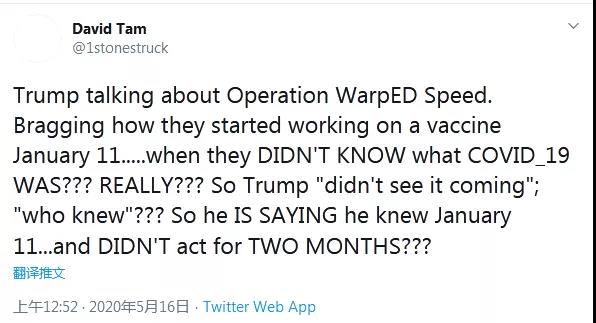 美国网友大卫·塔姆发推文质疑特朗普:“所以他是在说从1月11日就了解情况,却在未来两个月内毫无作为?”