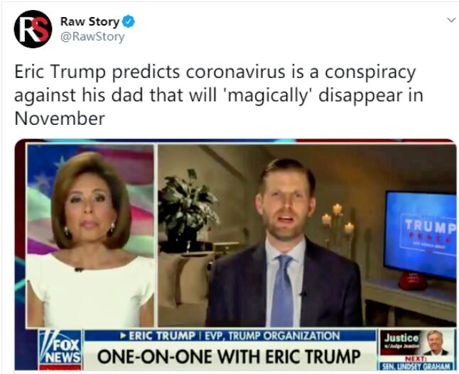 “所以你瞧着吧,从现在开始到11月3日 (大选日) ,他们每一天都会不断利用这个局势。但你猜怎么着,等到了11月3日之后,冠状病毒会突然神奇地消失的,然后所有人就都能出来了。他们就是想夺走我父亲最重要的资产,即美国人民对他的爱戴”,他说。