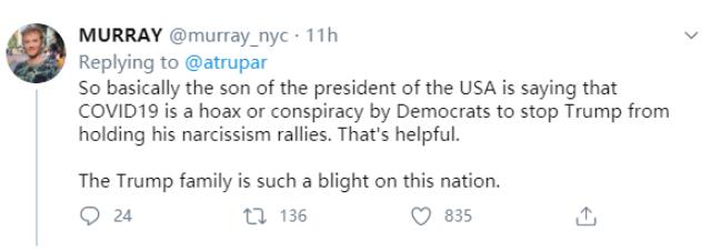 “所以这位美国总统的儿子是在说新冠肺炎只是一场美国民主党用来阻止他父亲去搞竞选集会的骗局或阴谋。他们一家人可真是这个国家的祸害啊。”