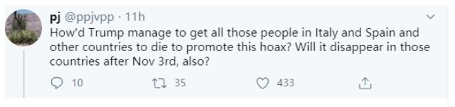“既然特朗普说这是场骗局,那意大利和西班牙那么多人又是因为什么病死的呢?这些国家的疫情会不会也在11月3日之后消失呢?”