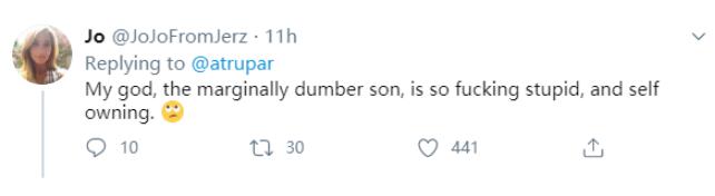 还有些美国网民干脆直接攻击起埃里克来,说他真是一个“蠢到家”的儿子,并贴出了一个表情包,上面写着:“在特朗普家还能被视为是最蠢的人,想象一下这得有多羞辱吧……”