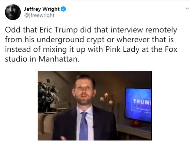 另外,有美国网民还注意到一个极为讽刺的细节,就是暗示新冠肺炎是阴谋乃至骗局的埃里克,似乎是躲在他家的地下室接受的福克斯新闻网的远程采访……