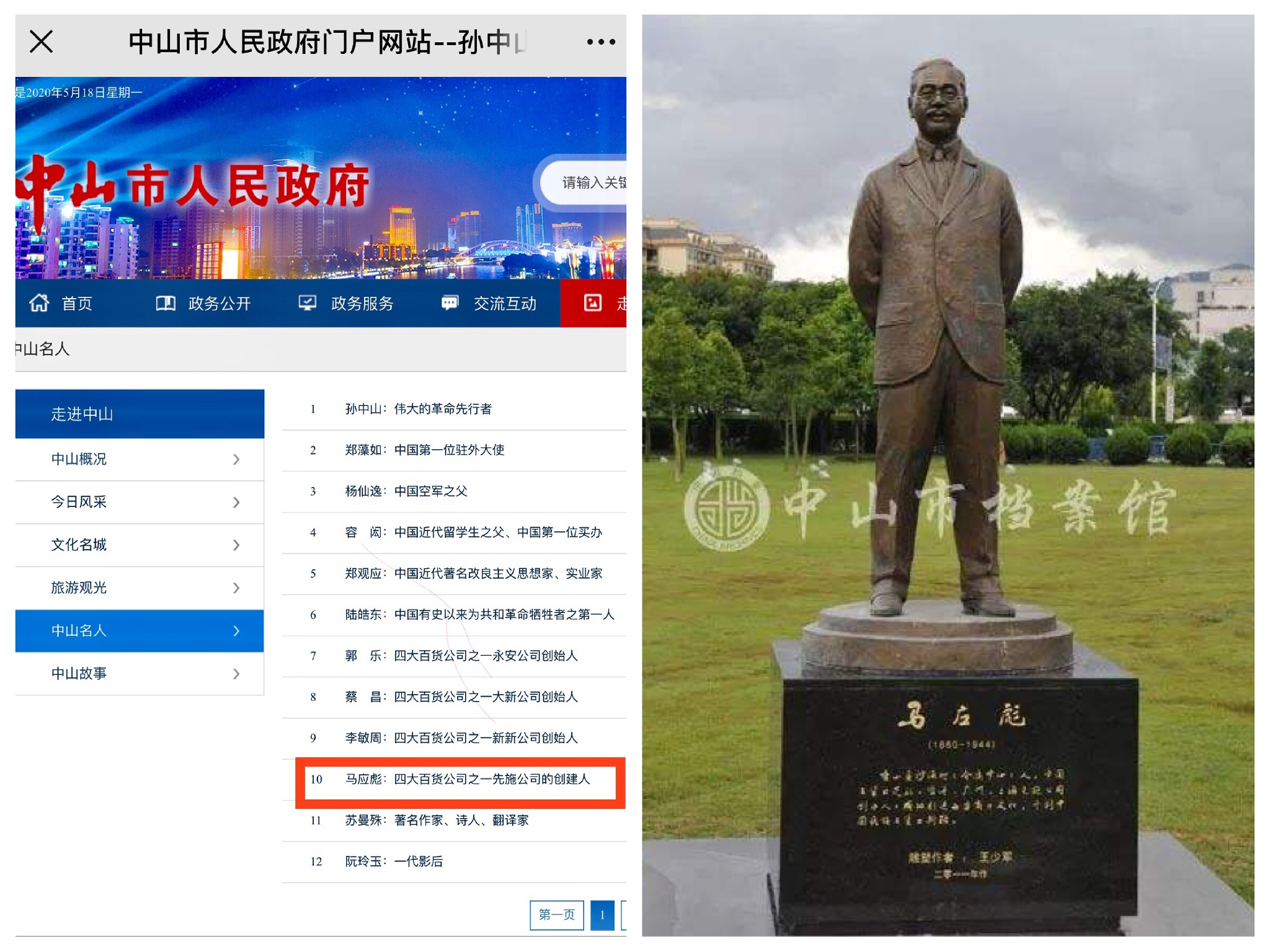 【香港商報訊】記者 黃鳳鳴 報道:在廣東省中山市的官方記載中,馬應彪絕對是個響噹噹的人物。他創辦的先施公司在中國民族工商業史上舉足輕重,也因此被譽為「中國百貨業的先驅」、「中國近代百貨第一人」。