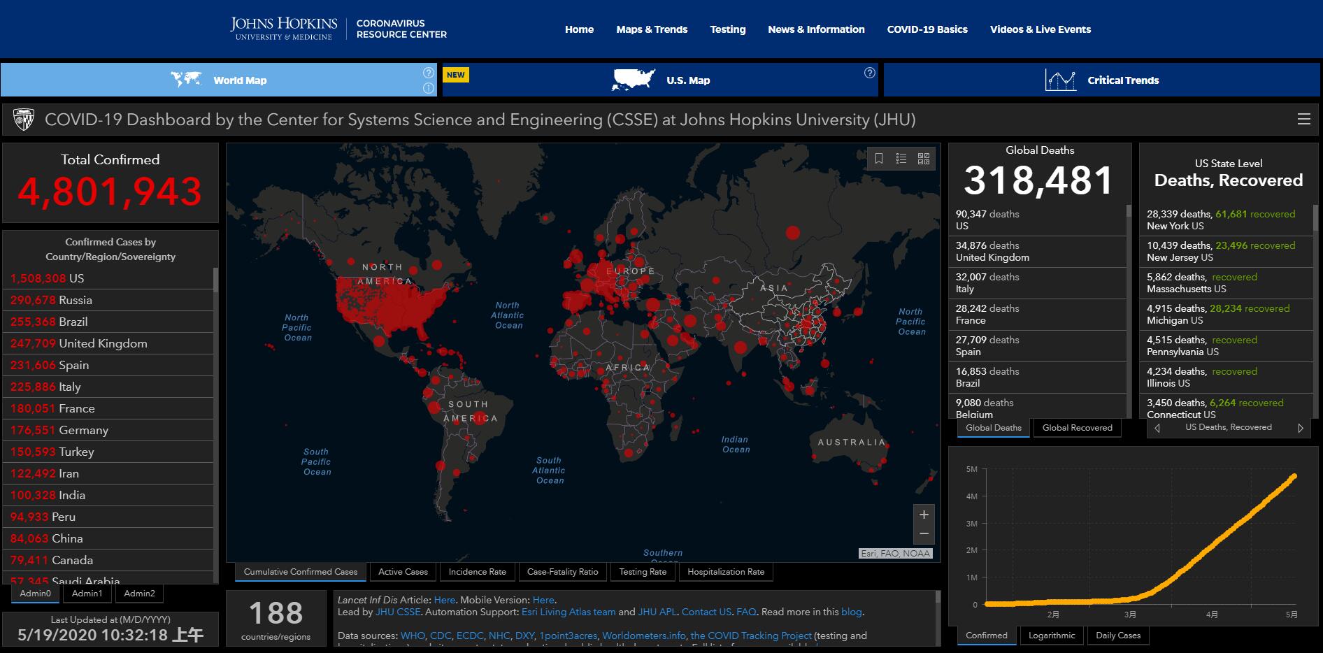 美国约翰斯·霍普金斯大学发布的实时统计数据显示,截至香港时间5月19日10时32分左右,全球累计确诊新冠肺炎病例超480万,达4801943例,累计死亡318481例。
