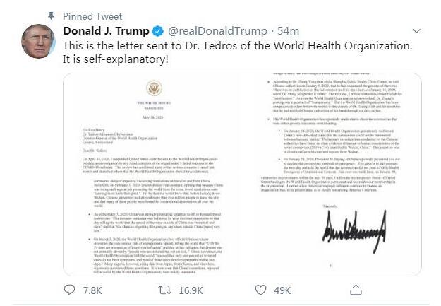 据此前报道,特朗普于当地时间5月18日在社交媒体公布发给世卫组织总干事谭德塞的信件,信中要求世卫组织在30天内进行重大实质性改革,否则美国将永久停止对世卫组织的资助,且考虑退出世卫组织。