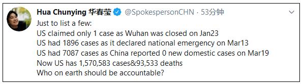 华春莹首先列举了一些数据和事实情况:武汉1月23日“封城”时,美国当时仅仅只有1例新冠肺炎确诊病例;当3月13日美国进入“国家紧急状态”时,确诊病例数达到了1896例;3月19日中国的本土确诊病例数“清零”,而此时美国已激增到7087例;如今美国确诊1570583例,死亡病例为93533例。