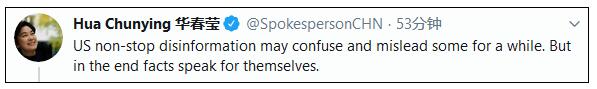 随后华春莹又连发数条推特,她表示:美国政府无休止地造谣在一段时间内可能会迷惑和误导一批人,但最终事实终将证明一切。