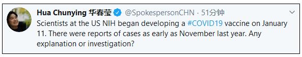 华春莹对此也表示怀疑,她写道:美国国家卫生研究院(NIH)1月11日就开始研制新冠疫苗,去年11月也已出现确诊病例,美方有任何解释和调查吗?