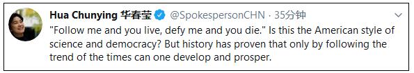 华春莹表示,“顺我者昌,逆我者亡”,这难道就是所谓的“美式科学”与“美式民主”吗?她接着指出一则铁律,那就是只有顺应时代的发展,才能真正发展壮大。