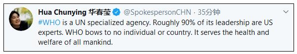 华春莹在推特上对此回应表示,世卫组织是联合国的专门机构,其中约90%的领导层都是美国专家,世卫组织不会向任何个人和国家“卑躬屈膝”,它的宗旨是为全人类的健康和福利服务。