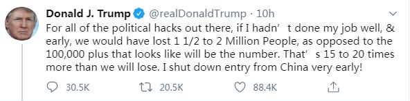 截至当地时间5月27日,美国新冠肺炎累计确诊病例超过172万例,累计死亡超10万人。然而,美国总统特朗普还在推特上发文自夸,称“如果不是我且行动得早,我们将失去150万至200万人,损失将是现在的15到20倍”。