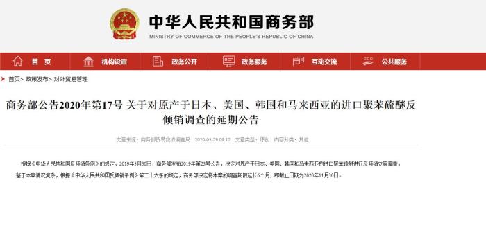【香港商报网讯】据商务部网站消息,商务部29日发布公告称,根据《中华人民共和国反倾销条例》的规定,2019年5月30日,商务部发布2019年第23号公告,决定对原产于日本、美国、韩国和马来西亚的进口聚苯硫醚进行反倾销立案调查。鉴于本案情况复杂,根据《中华人民共和国反倾销条例》第二十六条的规定,商务部决定将本案的调查期限延长6个月,即截止日期为2020年11月30日。