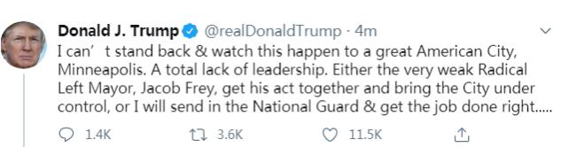特朗普在推文中写道,“我不能袖手旁观,眼睁睁地看着明尼阿波利斯这座伟大的美国城市发生这样的事情。(这座城市)完全缺乏领导力。要么是非常软弱的激进左翼市长雅各布·弗雷采取有效行动让这座城市得到控制,要么我会派遣国民警卫队,把事情做好。”