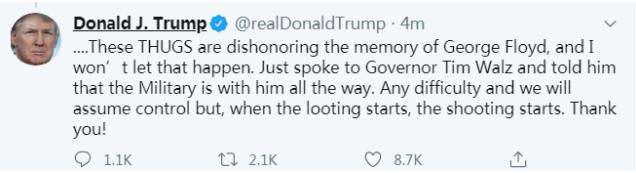 特朗普进一步表示,“这些暴徒(thugs)是在玷污(我们对)乔治·弗洛伊德的回忆,我不会让这种事情发生。(我)刚刚与(明尼苏达州)州长蒂姆·瓦尔茨通过电话,(我)告诉他军队一直同他在一起。(不管)任何困难,我们都会取得控制,但是,当抢劫开始,(开枪)射击也就开始了。谢谢!”