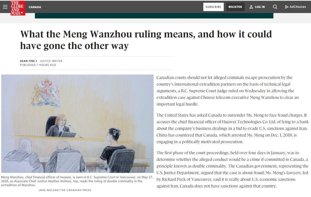 在裁决结果公布後,加拿大发行量最大的全国性日报《环球邮报》(Global and Mail)发表了题为《关於孟晚舟的判决意味着什么,以及结果还能是怎样?》的文章。该文首先解释了此次法官的观点,也列举了其他法律界人士的不同意见。