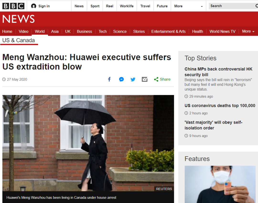 英国BBC的报道将此案视为中美「5G争端」的一部分。在判决结果出来後,BBC科技记者分析认为「孟晚舟案在5G争端中为美国加码」。