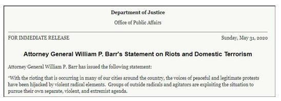 “非裔遭美国警察跪压致死案”引发的示威风波在全美愈演愈烈,5月31日,美国司法部长威廉·巴尔在一份官方声明中表示,在全美抗议活动中,“安提法”(antifa)和其他“类似组织”在骚乱中煽动与实施暴力,已构成“国内恐怖主义”。