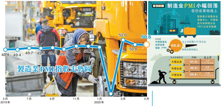 【香港商報網訊】國家統計局昨日公布數據,5月份,中國製造業採購經理指數(PMI)為50.6%,比上月回落0.2個百分點,但繼續保持在臨界點以上。