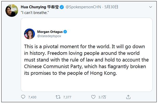 可是,奥布莱恩提出的“证据”,仅仅只是中国外交部发言人华春莹所发的一条推文。上周六,美国国务院发言人摩根·奥塔格斯(Morgan Ortagus)发布了一条关心香港的推特,并呼吁世界上热爱自由的人向中共问责。对此,中国外交部发言人华春莹用“我不能呼吸了”(乔治·佛洛依德被压住颈部时说的话)一句进行回应。奥布莱恩宣称,这就是中国政府公开、直接的介入,并表示会对其进行密切留意。