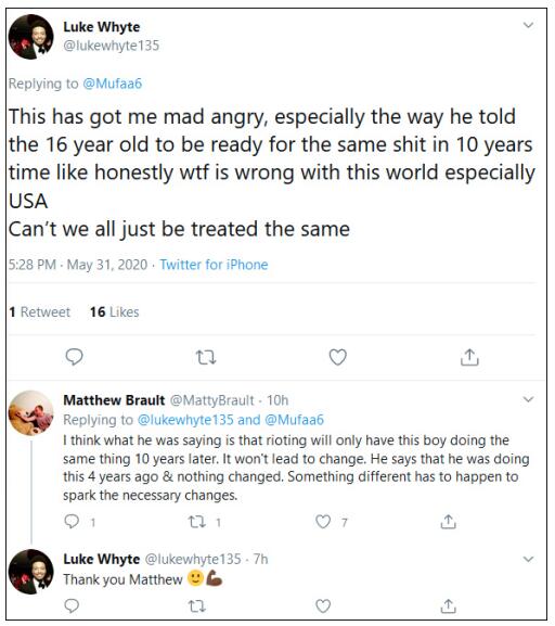 而另一位网友则从另一个角度表达了观点,即从目前看来,持续的暴力是无法改变现状的。他回复道,“31岁男子的意思是,暴乱只会让这个男孩在10年後做同样的事情,它不会引领改变。现在最重要的是要有更好的办法,来激活一些必要的改变。”