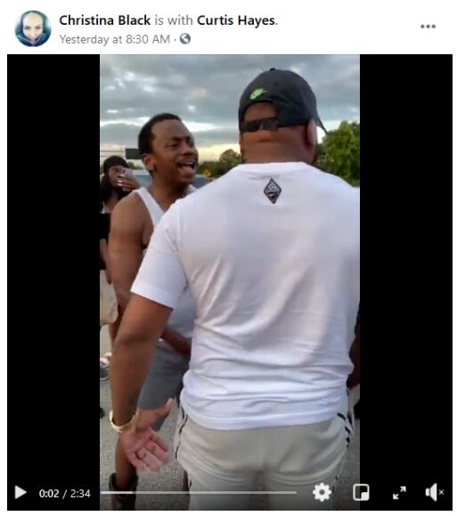 该视频是一位脸书账号为@Christina Black 的网友发布的,具体地点未知,但通过对话能够推断出,有人在抗议中进行抢劫,而有人正出面阻拦。