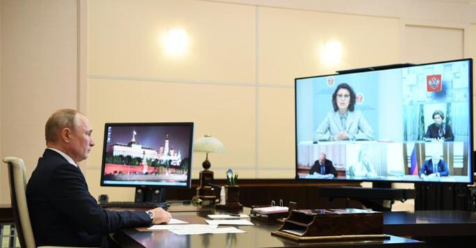 6月1日,在位于俄罗斯莫斯科州的新奥加廖沃总统官邸,俄总统普京与中央选举委员会领导层和宪法修正案起草工作组成员举行工作会议。 新华社/卫星社