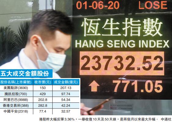 【香港商報網訊】記者吳天淇報道:內地經濟數據勝預期,加上美國宣稱對本港採取的制裁影響微弱,港股6月首日大幅反彈771點,一舉收復10天及50天線,是兩個月以來最大升幅。國企指數升272點報9833點,全日成交增加至1507億元。後市憧憬中概股陸續來港,恒指有望進一步造好。