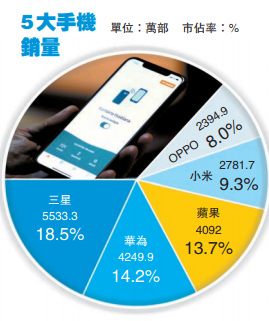 Gartner高級研究分析師吉塔表示,疫情令智能手機市場經歷有史以來最嚴重下滑。大部分領先的中國內地品牌及蘋果,都因其在內地的工廠臨時關閉而受到影響,而消費者的支出也因疫情而減少。當中,三星、華為及Oppo銷量齊齊錄得雙位數跌幅,分別跌22.7%、27.3%及19.1%,而蘋果iPhone亦跌8.2%,五大智能手機製造商中僅小米錄得升1.4%,銷量2781.7萬部,市佔率9.3%,排行第四。雖然今年首季三星銷量下滑至約5533.3萬部,惟其市場份額達18.5%,仍為市場一哥。華為銷量跌至4249.9萬部,市佔率達14.2%,列第二。
