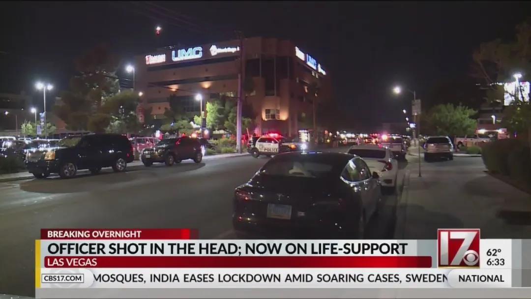拉斯维加斯警局警长隆巴迪(Joe Lombardo)周二凌晨透露,遭枪击的警员正在医院抢救,目前已接入生命维持设备,情况危急。