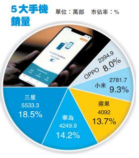 Gartner高級研究分析師吉塔表示,疫情令智能手機市場經歷有史以來最嚴重下滑。大部分領先的中國內地品牌及蘋果,都因其在內地的工廠臨時關閉而受到影響,而消費者的支出也因疫情而減少。當中,三星、華為及Oppo銷量齊齊錄得雙位數跌幅,分別跌22.7%、27.3%及19.1%,而蘋果iPhone亦跌8.2%,五大智能手機製造商中僅小米錄得升1.4%,銷量2781.7萬部,市佔率9.3%,排行第四。雖然今年首季三星銷量下滑至約5533.3萬部,惟其市場份額達18.5%,仍為市場一哥。華為銷量跌至4249.9萬部,市佔率達14.2%,列第二。