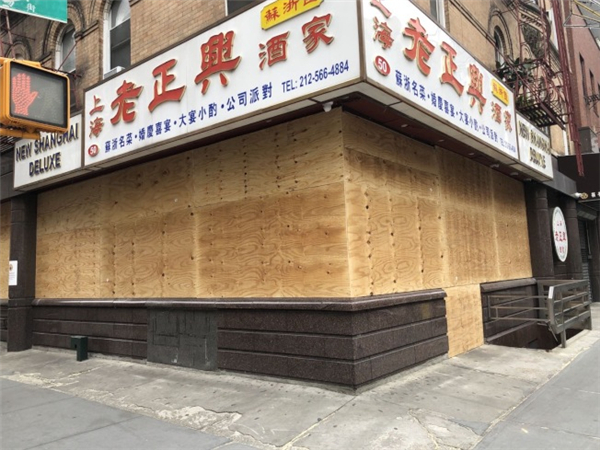 擔心遭暴徒破壞,加州華埠商店釘上木板。網絡圖片