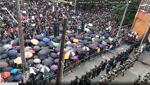 在加州西雅圖,示威者組成傘陣與警方對峙。網絡圖片