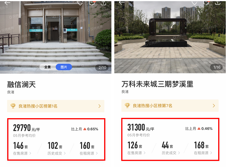 6月4日下午,中新经纬记者在贝壳找房APP上看到,该小区挂牌出售的房源有146套,佔到总房源的36%,销售均价约2.9万元/平方米,且幾乎都是毛坯状态。贝壳找房显示,该小区是杭州良渚热搜小区榜第1名,已经成交102套二手房。