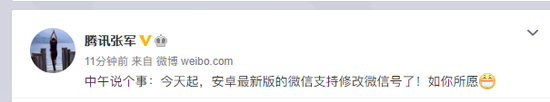 腾讯张军也发微博称,安卓最新版的微信支持修改微信号了!如你所愿。