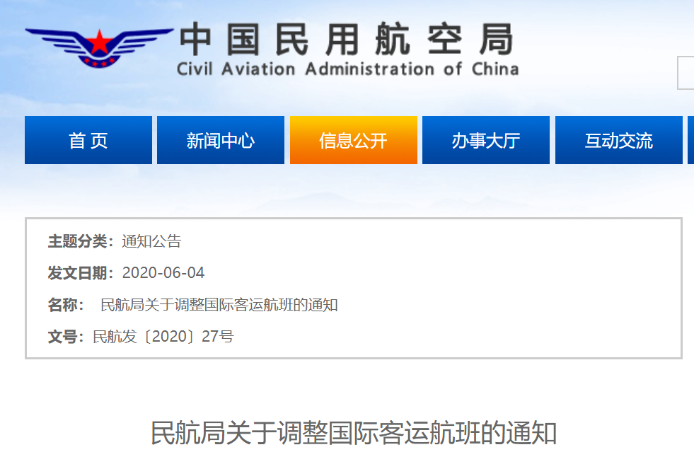 6月4日,中國民航局發佈關於調整國際客運航班的通知,實施國際航班獎勵和熔斷措施,44家外國航司每週可增加航班44班。同時,民航局還公佈了具備國際客運航班接收能力的37個口岸城市名單,II類機場全部在列。