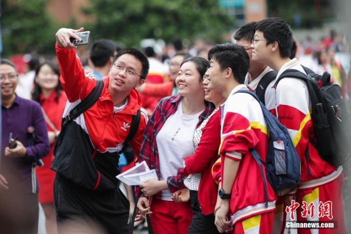 资料图:6月7日,贵阳一中考点,考生自拍留念。当日,2019年中国高考拉开帷幕。中新社记者 贺俊怡 摄