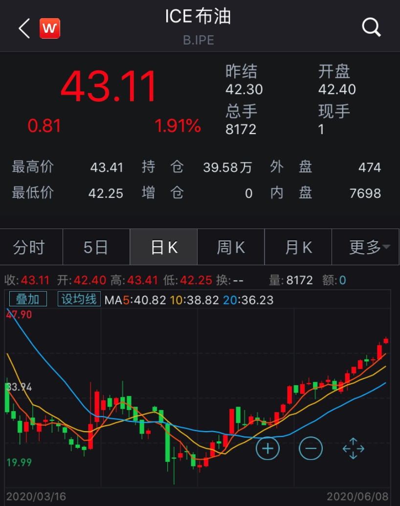 截至收盘,布伦特原油期货价格报43.32美元,涨幅2.4%。美国轻质原油期货价格报40.38美元,涨幅2.1%。两者均创下今年3月6日以来的最高水平。