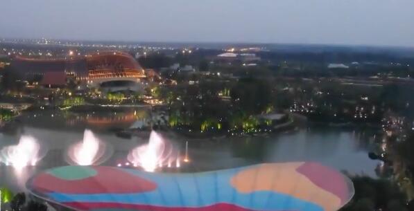 而在北京世园公园里的中国馆、永宁阁、音乐喷泉等标志性景观也被多彩光影同时点亮。