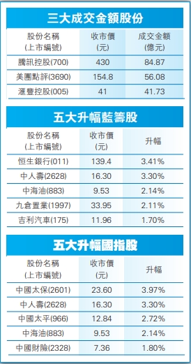 資金持續追入落後的本地股,恒生銀行(011)升3.4%,是表現最佳藍籌。恒基地產(012)及長實(1113)一眾地產股造好。豐控股(005)撐市升1.2%,友邦保險(1299)升0.9%,兩股合共貢獻恒指53點。