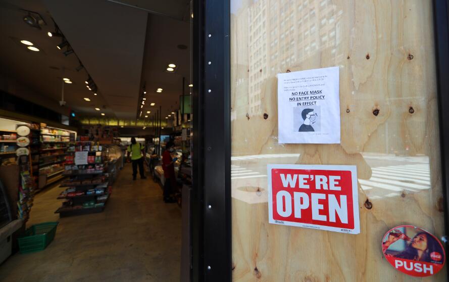 纽约一家商店的门口贴着佩戴口罩方可进入的提示。新华社