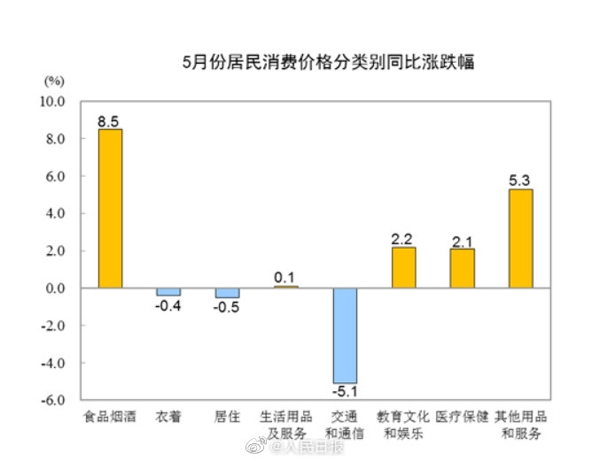 5月份,全国居民消费价格环比下降0.8%。其中,城市下降0.7%,农村下降0.9%;食品价格下降3.5%,非食品价格持平;消费品价格下降1.2%,服务价格持平。