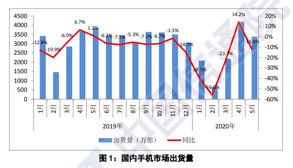 報告顯示,從國內手機市場來看,2020年5月,國內手機市場總體出貨量3375.9萬部,同比下降11.8%;1-5月,國內手機市場總體出貨量累計1.24億部,同比下降18.0%。2020年5月,國內手機上市新機型32款,同比下降22.0%。1-5月,上市新機型累計169款,同比下降18.8%。