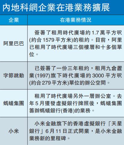 【香港商报网讯】记者鍾颖琳、吕希蕴报道:中概股回归潮打响头炮,2020年中概股第一股网易(9999)昨在港正式上市。与此同时,中资科技公司亦持续扩大香港版图。据悉,阿里集团最近在时代广场最少承租三层写字楼,TikTok母企字节跳动亦在时代广场租用了约3000平方呎(约合279平方米)的办公空间。疫情重挫环球经济下,全球不少公司打算缩减其在港办公室规模,惟内地科技公司却在全球最贵写字楼市场扩大办公空间,可见香港魅力未减,仍是内地TMT企业走向国际之首选。