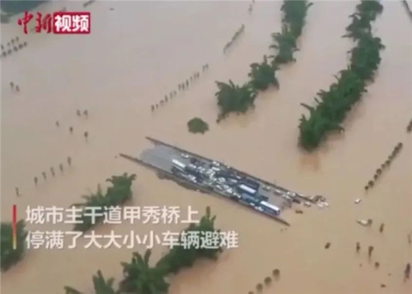 在广西阳朔,暴雨致使全县9个乡镇出现洪涝灾害,受灾人口逾15万人,全县酒店、民宿进水受损1000餘家,商业铺面进水5000餘间,旅遊景区景点受损30餘家。 阳朔县城的甲秀桥上停满了大大小小的避涝车辆。